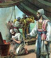 1 Kings 12:25–33 reports a parallel story of golden calves. King Jeroboam of the northern Kingdom of Israel made two calves of gold out of a desire to prevent the kingdom from returning to allegiance to the house of David and the southern Kingdom of Judah.[75] In Exodus 32:4, the people said of the Golden Calf, "This is your god, O Israel, that brought you up out of the land of Egypt." Similarly, in 1 Kings 12:28, Jeroboam told the people of his golden calves, "You have gone up long enough to Jerusalem; behold your gods, O Israel, that brought you up out of the land of Egypt." Jeroboam set up one of the calves in Bethel, and the other in Dan, and the people went to worship before the calf in Dan.[76] Jeroboam made houses of high places, and made priests from people who were not Levites.[77] He ordained a feast like Sukkot on the fifteenth day of the eighth month (a month after the real Sukkot), and he went up to the altar at Bethel to sacrifice to the golden calves that he had made, and he installed his priests there.[78]