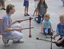 The manipulation of the devil stick (also devil-sticks, devilsticks, flower sticks, gravity sticks, or juggling sticks) is a form of gyroscopic juggling or equilibristics, consisting of manipulating one stick ("baton") between one or two other sticks held one in each hand. The baton is lifted, struck, or stroked by the two control sticks ('handsticks' or 'sidesticks'), stabilising the baton through gyroscopic motion.[1]