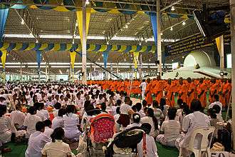 Luang Por Dhammajayo was heavily influenced by Maechi Chandra Khonnokyoong in his teachings. He turned the Dhammakaya meditation method "into an entire guide of living" (McDaniel), emphasizing cleanliness, orderliness and quiet, as a morality by itself, and as a way to support meditation practice.[336][337][338] In Taylor's words, the temple "eschews disorder".[160] In Wat Phra Dhammakaya, ceremonies are commonly held on Sundays rather than the traditional lunar calendar-based Uposatha days. Free buses drive to the temple. Lay people joining the ceremonies are strongly encouraged to wear white, a traditional custom. No smoking, drinking or flirting is allowed on the temple terrain, nor newspapers, animals or fortune-telling. Traditional, noisy temple fairs are not held. Children attending activities at Wat Phra Dhammakaya are taken care of through Sunday school and crèche while their parents attend the adult meditation sessions in the Great Sapha Dhammakaya Hall. There are activities for children and young people: people of all ages attend activities. Moreover, the temple teaches regularly about traditional Thai manners.[86][339] In short, the temple's appearance is orderly, and can be described as "a contemporary aesthetic" (Scott), which appeals to practitioners, especially the modern Bangkok middle class.[39][304][340] Practitioners are also encouraged to keep things tidy and clean, through organized cleaning activities. A strong work ethic is promoted through these activities, in which the most menial work is seen as the most valuable and fruitful.[335][341] The temple's emphasis on discipline and order is expressed in its huge and detailed ceremonies.[342]