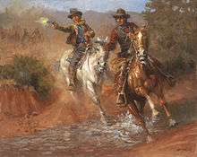 Dick Brewer, Billy the Kid and the Regulators is a painting by artist Andrew "Andy" Thomas that depicts the Regulators as they hunt down William Morton and Frank Baker for the murder of businessman John Tunstall. This painting was sold at the Midwest Gathering of Artists in Carthage, Missouri on September 11, 2010.[1]