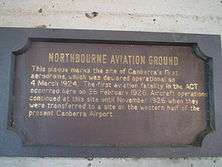 - This plaque marks the site of Canberra's first aerodrome, which was declared operational on 4 March 1924. The first aviation fatality in the ACT occurred here on 26 February 1926. Aircraft operations continued at this site until November 1926 when they were transferred to a site on the western half of the present Canberra Airport.