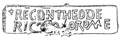 Brick with the emblem of Theodoric, found in the temple of Vesta, Rome. It reads "+REG(nante) D(omino) N(ostro) THEODE/RICO [b]O[n]O ROM(a)E", which translates as With our master Theodoric the Good reigning in Rome [this brick was made].
