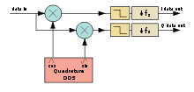 The DDS generates a complex sinusoid at the intermediate frequency (IF). Multiplication of the intermediate frequency with the input signal creates images centered at the sum and difference frequency (which follows from the frequency shifting properties of the Fourier transform). The lowpass filters pass the difference (i.e. baseband) frequency while rejecting the sum frequency image, resulting in a complex baseband representation of the original signal. Assuming judicious choice of IF and LPF bandwidth, the complex baseband signal is mathematically equivalent to the original signal. In its new form, it can readily be downsampled and is more convenient to many DSP algorithms.