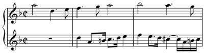 For Heinrich Schenker, "all foreground is diminution".[4] "All diminution must be secured firmly to the total work by means which are precisely demonstrable and organically verified by the inner necessities of the voice-leading".[5] This conception has been essential to Schenker's theory from some of his earliest writings.[6] In Schenkerian analysis a diminution is an elaboration by which an event formed of notes of longer value is expressed in notes of smaller value. See nonchord tone.