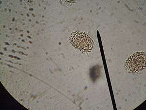 Eggs are 60-80 micrometres x 39-47 micrometres, contain an embryo, and have characteristic sculpturing of the shell.[3] They have an oval-shape and brownish-yellow hue. Eggs have a thick shell, and the surface appears to be pitted except at the poles.