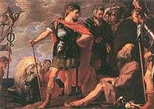 According to a story which seems to have originated with Menippus of Gadara,[24] Diogenes was captured by pirates while on voyage to Aegina and sold as a slave in Crete to a Corinthian named Xeniades. Being asked his trade, he replied that he knew no trade but that of governing men, and that he wished to be sold to a man who needed a master. In fact, this was a pun. In ancient Greek this would sound both as "Governing men" and "Teaching values to people".[25] Xeniades liked his spirit and hired Diogenes to tutor his children. As tutor to Xeniades's two sons,[26] it is said that he lived in Corinth for the rest of his life, which he devoted to preaching the doctrines of virtuous self-control. There are many stories about what actually happened to him after his time with Xeniades's two sons. There are stories stating he was set free after he became "a cherished member of the household", while one says he was set free almost immediately, and still another states that "he grew old and died at Xeniades's house in Corinth."[27] He is even said to have lectured to large audiences at the Isthmian Games.[28]