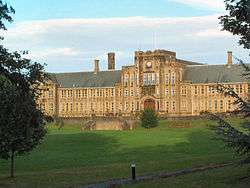 Donnison called the first group "regional schools": large, highly academically selective day schools with large sixth forms, located near large cities, and mostly boys' schools belonging to the Headmaster's Conference.[38] The archetype of the direct grant grammar school, was the largest, Manchester Grammar School, whose High Master from 1945 to 1962, Eric James (elevated to the peerage in 1959), was an outspoken advocate of the "meritocracy".[39][lower-alpha 2] In 1968 the school sent 77% of its boys on to university, a rate surpassed only by the independent Winchester College.[41] Close behind were such schools as Bradford Grammar School, Leeds Grammar School, Haberdashers' Aske's School and Latymer Upper School.[31] A large girls' school of similar academic attainment was North London Collegiate School, which had been founded in 1850 by Frances Buss. These schools achieved university admission rates that rivalled the older public schools, which in turn moved to raise their academic standards for admission, and to increase their focus of academic achievement.[42] With their high profile, such schools formed the popular image of a direct grant grammar school, but they accounted for only about a quarter of them.[38]