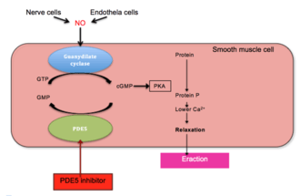 Penile erection is a hemodynamic event in the smooth muscle of corpus cavernous.[10] PDE5 is the main cGMP hydrolysing enzyme found in penile corpus cavernous.[11] Erection is triggered by release of the neurotransmitter nitric oxide (NO) from non-adrenergic and non-cholinergic neurons from nerve ending in the penis as well as from endothelial cells. NO activates soluble guanylyl cyclase in smooth muscle cells in the penis which results in increased production of 3'-5'-cyclic guanosine monophosphate from guanosine-5'-triphosphate (GTP).[5][12][13] Cyclic GMP binds to the cGMP-dependent protein kinase (PKG1) which phosphorylates several proteins that results in decreased intracellular calcium. Lower intracellular calcium leads to smooth muscle relaxation and ultimately penile erection. This pathway is demonstrated in figure 1.[13][14]