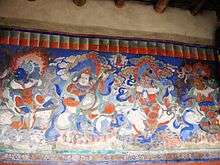 Diskit Monastery also has an elevated cupola, with a fresco depicting the Tashilhunpo Monastery of Tibet. It also has a number of shrines and Mongolian and Tibetan texts in the storehouse.[3] Diskit Monastery is connected to Mongol mythology in that the monastery is believed to be the place where an evil anti-Buddhist Mongol demon once lived and was killed near the monastery grounds but is said to have been resurrected several times.[3] Today, the wrinkled head and hand of the demon are believed to lie inside a temple in the monastery.[3] The Lonely Planet India guide describes that the gompa roof offers "glorious" views of the Nubra Valley.[1]