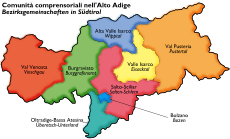 In South Tyrol their name is Comunità comprensoriale or Comprensorio (in Italian), Bezirksgemeinschaft (in German), Cumunità raion or Comunitè comprensoriala (in Ladin). In Trentino is Comunità di valle[1] (in Italian) and Talgemeinschaft[2] (in German).