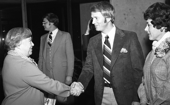 Nonetheless, she quickly alienated fellow Democrats with her conservative views on energy and the environment. She approved allowing supertankers to dock in Puget Sound, championed support for unrestrained growth and development, and continued to express enthusiasm for atomic power.[3] She, likewise, alienated the state's Republican establishment after she fired 124 appointees of her predecessor, three-term governor Daniel J. Evans, offering to send them "a box of kleenex with their pink slips."[15] She filled their places with old colleagues, described by some as "yes men."[16] Her treatment of the media was similarly dismissive. Local television reporter Paul Boyd once interviewed the governor while she was dressed in "a ratty Ban-lon sports shirt, sweat pants covered with dog hair, red socks, and tennis shoes." [8]