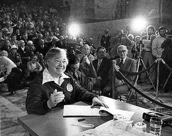 Ray narrowly won the Democratic nomination over Seattle mayor Wes Uhlman, having spent almost no money on her campaign, having no experience in running for elected office, and having little support from the state's political class.[8] Despite opposition from all major newspapers and predictions from pundits that the state was not ready "for an unmarried woman who gave herself a chainsaw for Christmas," Ray went on to win the general election with a victory over King County Executive John D. Spellman.[15] On election night, asked by a reporter to explain her surprise victory, she offered, "it can't be because I'm so pretty?"[1]