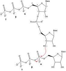 Once two nucleotides are bound to the primase, DnaG catalyzes the formation of a dinucleotide by forming a phosphodiester bond via dehydration synthesis between the 3' hydroxyl of the nucleotide in the initiation site and the α-phosphate of the nucleotide in the elongation site. This reaction results in a dinucleotide and breaking of the bond between the α and β phosphorus, releasing pyrophosphate. This reaction is irreversible because the pyrophosphate that is formed is hydrolyzed into two inorganic phosphate molecules by the enzyme inorganic pyrophosphatase.[7] This dinucleotide synthesis reaction is the same reaction as any other enzyme that catalyzes the formation of DNA or RNA (DNA Polymerase, RNA Polymerase), therefore DnaG must always synthesize oligonucleotides in the 5' to 3' direction. In E. coli, primers begin with a triphosphate adenine-guanine (pppAG) dinucleotide at the 5' end.