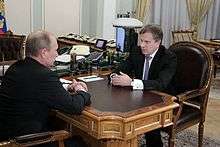 Aeroflot CEO Vitaly Savelyev meeting with Russian President Vladimir Putin at Novo-Ogaryovo in October 2012, during which discussions surrounding what would eventually lead to the creation of Dobrolet were held.