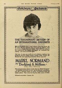 Dodging a Million is a 1918 American comedy film starring Mabel Normand and Tom Moore, directed by George Loane Tucker, written by A. M. Kennedy, Edgar Selwyn, and Loane, and photographed by Oliver T. Marsh. The black and white silent film was released by the Goldwyn Pictures Corporation. It is not known whether the film currently survives,[1] and it may be a lost film.[2]