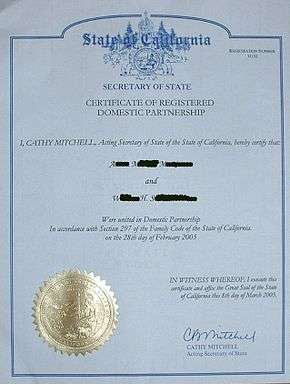 - ↑ "Domestic Partners Registry". California Secretary of State. Retrieved 8 November 2010.