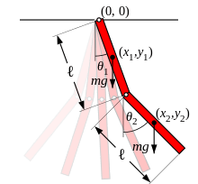 In physics and mathematics, in the area of dynamical systems, a double pendulum is a pendulum with another pendulum attached to its end, and is a simple physical system that exhibits rich dynamic behavior with a strong sensitivity to initial conditions.[1] The motion of a double pendulum is governed by a set of coupled ordinary differential equations and is chaotic.