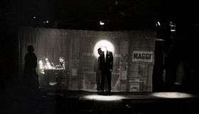 At times, while songs were being sung by Agnes Bernelle, the curtain was an opaque surface, like a white chalk board, and at other times, the curtain became transparent, revealing a scene from the play behind (see photos, right). The curtain was suspended on a simple set of wires, and parted in the middle to reveal each scene.[3]