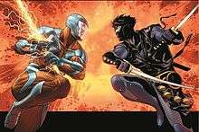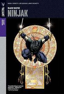 Ninjak is a fictional superhero appearing in eponymous American comic books published by Valiant Comics and Acclaim Comics. Co-created by writer Mark Moretti and artist Joe Quesada, the character first appeared in Bloodshot #6 as Colin King and quickly gained his own series. The Ninjak series was very popular and Ninjak #1 placed number one on Wizard Magazine's Top Ten Hottest Comics of the month article in February 1994.[1] The lead character is ninja spy Ninjak, whose alter ego is British playboy Colin King. Ninjak immediately hit with readers, with the first issue selling close to 1 million copies. Ninjak has become one of the most popular Valiant characters continuing a long run and selling millions more copies to date. Ninjak comics have been translated into a number of languages including German, Italian, Spanish, Norwegian, Filipino, and Chinese[2] among others.