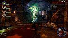 Combat focuses on the player's ability to prepare, position, and form a cohesive team with their party members.[26] Inquisition features two forms of combat systems.[27] The first is reminiscent of that which is found in most action role-playing games, including Dragon Age II. During combat, players can switch to control other party members, while artificial intelligence will take control of the Inquisitor and other members in the party.[28] This system is action-oriented and follows the player in a typical over-the-shoulder third person style. The second is closer to that of classic role-playing games, including Dragon Age: Origins.[29] This combat system allows players to pause the game, assign locations and orders to the party members and then resume the game to see it played out.[30] During the use of this second more strategic combat system, the camera will be closer to that of a top down view, instead of the usual over-the-shoulder third person style of the action based combat system. This combat system is named Tactical View and allows for the placing of traps while the game is paused.[31] The Inquisitor also has the ability to close and manipulate the rift, which can stun all the enemies nearby.[32]