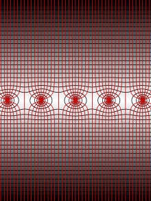 The drift chamber functions by balancing the loss of energy from particles caused by impacts with particles of gas, with the accretion of energy created with high-energy electrical fields in use to cause the particle acceleration.[13] Design is similar to the Mw chamber but instead with central layer wires at a greater distance apart.[8] The detection of charged particles within the chamber is possible by the ionizing of particles of gas due to the motion of the charged particle.[14]