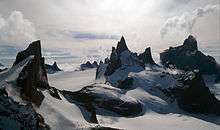 There is no ice-free land at the coast; the coast consists of a 20-to-30-metre high (70 to 100 ft) wall of ice throughout almost the entire territory.[12][13][14] It is thus only possible to disembark from a ship in a few places.[14] Some 150 to 200 kilometres (90 to 120 mi) from the coast, rocky peaks pierce the ice cap, itself at a mean height of around 2,000 metres (6,600 ft) above sea level, with the highest point at Jøkulkyrkja (3,148 metres or 10,328 feet) in the Mühlig-Hofmann Mountains.[12][13] The other major mountain ranges are the Heimefront Range, Orvin Mountains, Wohlthat Mountains and Sør Rondane Mountains.[2]