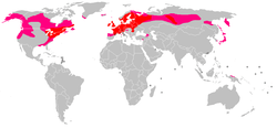 It is found in much of Europe, including the British Isles, most of France, the Benelux nations, Germany, Denmark, Switzerland, Czech Republic, Poland, Belarus, the Baltic countries, Sweden and Finland, as well as northern portions of Portugal, Spain, Romania and in Iceland and southern regions of Norway and Greenland. It is infrequent in Austria and Hungary, and some populations are scattered around the Balkans.