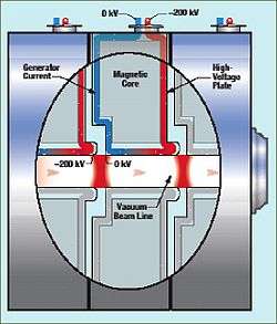 One of the design problems was designing the new induction cores to fit in the confines of the previous facility. The design team had to replace the ferrite used in the first axis cores with "metglass"—paper-thin ribbons of amorphous iron tape. The maximum magnetic field strength (saturation point) in metglas is five times higher than in ferrite. The magnetic tape was insulated by thin layers of mylar and wound up into a roll of 20,000 turns to make mammoth six-foot-diameter cores, each four inches wide and weighing more than one and a half tons. Four cores fit into each induction cell.[1]
