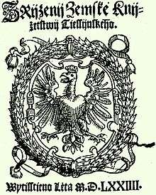 The Duchy of Teschen (German: Herzogtum Teschen), also Duchy of Cieszyn (Polish: Księstwo Cieszyńskie) or Duchy of Těšín (Czech: Těšínské knížectví, Latin: Ducatus Tessinensis) was an autonomous Silesian duchy centered on Cieszyn (Teschen) in Upper Silesia. During the feudal division of Poland it was split off from the Duchy of Racibórz in 1281 and ruled by Silesian dukes of the Piast dynasty from 1290.[1]