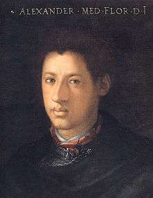 Il Duca di Firenze, rendered in English as The Duke of Florence, was a title created in 1532 by Pope Clement VII. There were effectively only two dukes, Alessandro de' Medici and Cosimo de' Medici, the second duke being elevated to The Grand Duke of Tuscany, causing the Florentine title to become subordinate to the greater Tuscan title.[1]