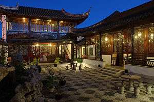 Traditional Chinese construction methods were applied throughout the garden to avoid the use of any nails or other corrodible materials. All wooden structures, made from Chinese fir, are held together using mortise and tenon joints. The timber has been coated in seven layers of protective lacquer to preserve its look and against decay. All of the wooden columns rest on hand-carved granite plinths sitting on the floor's granite slabs. This separates the timber from the ground to further prevent rotting.[4] Hand-carved hexagonal lanterns with shades depicting typical Chinese landscape paintings provide evening lighting for the corridors of the path running inside along the perimeter walls.