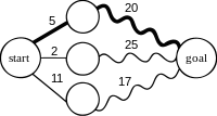 Figure 1. Finding the shortest path in a graph using optimal substructure; a straight line indicates a single edge; a wavy line indicates a shortest path between the two vertices it connects (other nodes on these paths are not shown); the bold line is the overall shortest path from start to goal.