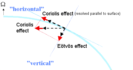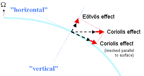 The diagrams also show the component in the direction parallel to the local surface. In meteorology and in oceanography, it is customary to refer to the effects of the component parallel to the local surface as the Coriolis effect.