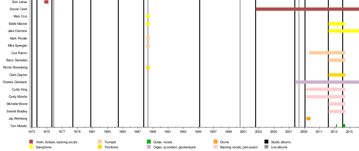 By 2002, the band also included Soozie Tyrell (violin, vocals). Tyrell had earlier worked with Scialfa touring with Southside Johnny and the Asbury Jukes and sporadically with Springsteen dating back to the early 1990s. Whether Tyrell became as full-fledged a member as the others remains unclear. Some press releases refer to her as a "special guest",[4] the cover notes of Live in Barcelona list her as a "with" member, the liner notes of We Shall Overcome: The Seeger Sessions refer to her as "violinist with the E Street Band," and some press releases don't mention her at all.[5] When asked about the lack of mention in a press release prior to the Magic Tour, Springsteen just said in response, "Soozie will be with us."[6]