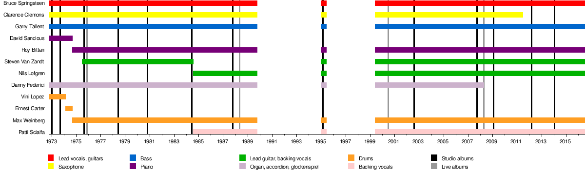 The original lineup included Garry Tallent (bass), Clarence Clemons (saxophone), Danny Federici (keyboards, accordion), Vini "Mad Dog" Lopez (drums) and David Sancious (keyboards). The band took its name from the street in Belmar, New Jersey, where Sancious' mother lived. She allowed the band to rehearse in her garage. ‘Bruce’ tourism to the area often mistakenly believe the house was on the corner of E Street and 10th Avenue, perhaps due to the song Tenth Avenue Freeze-Out about the band's beginnings. The Sancious house was at 1107 E Street with the garage squeezed between the house and the southside fence.[3]
