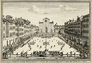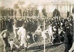 These archaic forms of football, typically classified as mob football, would be played between neighbouring towns and villages, involving an unlimited number of players on opposing teams, who would clash in a heaving mass of people struggling to drag an inflated pig's bladder by any means possible to markers at each end of a town. By some accounts, in some such events any means could be used to move the ball towards the goal, as long as it did not lead to manslaughter or murder.[8] Sometimes instead of markers, the teams would attempt to kick the bladder into the balcony of the opponents' church. A legend that these games in England evolved from a more ancient and bloody ritual of kicking the "Dane's head" is unlikely to be true.