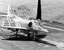 Starting in November 1960, McCain flew Skyraiders with the VA-65 "World Famous Fighting Tigers" squadron[59][63] on the aircraft carriers USS Intrepid and USS Enterprise.[64] The carriers were based at Naval Station Norfolk[63] and cruised in the Caribbean and in several deployments to the Mediterranean.[61] His aviation skills improved,[61][62] but around December 1961 he collided with power lines while recklessly flying too low over southern Spain.[62] The area suffered a power outage, but McCain was able to return his damaged Skyraider to Intrepid.[62]