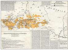Where Germans settled and expanded an already existing Slavic settlement, they either kept the Slavic name, translated it, renamed it or assigned a mixed German-Slavic name.[36] In most cases, the Slavic name was kept.[36] Sometimes, the Wends continued to live in a distinct small portion of the village, the Kiez. Where Germans founded a village in the vicinity of an existing Slavic settlement, which decayed afterwards, the new settlement was often named after the nearby Slavic one; seldom was a new name assigned.[36] If the Slavic settlement in the vicinity of the new German one did not decay, the German and Slavic settlements were distinguished by the attributes Deutsch- for the German and Wendisch- for the Slavic one,[36] or Klein- ("little") for the old settlement and Groß- ("large") for the new one. If the German settlement was founded with no Slavic settlement in the vicinity (aus wilder Wurzel, literally "wild rooted"), the name could either be German, the Slavic toponym for the area, or mixed.[36] Slavic-rooted German placenames are not an indicator of preceding Slavic settlements.[37] In some cases, as was shown for some Sudetenland villages, a German and a Slavic placename describing the same settlement co-existed for several centuries.[37]