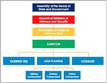 The Eastern Africa Standby Force (EASF), formerly Eastern Africa Standby Brigade (EASBRIG), is one of the five regional forces for Peace Support Operations (PSOs) of the African Standby Force, consisting of a military, police and civilian component. EASF constitutes the regional operational arm of the peacekeeping elements of the African Peace and Security Architecture, put in place by the 2002 Protocol Relating to the Establishment of the Peace and Security Council of the African Union.[1][2]