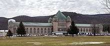 The site opened as the "Eastern New York Reformatory". Its imposing main building, with medieval-style turrets and long green copper roof, was designed by architect John Rochester Thomas, who had also designed Elmira. [1] The site was chosen partly for its easily available stone, and the transport provided by the adjacent Delaware and Hudson Canal; able-bodied adult prisoners were imported for construction labor.[2]