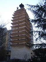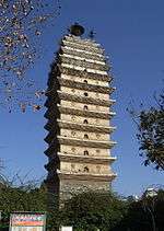 The Eastern and Western Pagodas (东寺塔与西寺塔; Dongsi Ta / Xisi Ta) are two pagodas, only about 200 metres (660 ft) apart, in the southern part of Kunming, Yunnan, China. Also known as the Pagoda of the East Temple (25°01′55″N 102°42′38″E / 25.0320°N 102.7106°E) and the Pagoda of the West Temple (25°01′55″N 102°42′24″E / 25.0319°N 102.7067°E),[1] they were constructed in the late eighth or early ninth century AD, under the rule of the Kingdom of Nanzhao.[2]