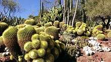 Echinocactus grusonii is widely cultivated by specialty plant nurseries as an ornamental plant, for planting in containers, desert habitat gardens, rock gardens, and in conservatories.[2] A white-spined form, and a short-spined form, are also in cultivation.