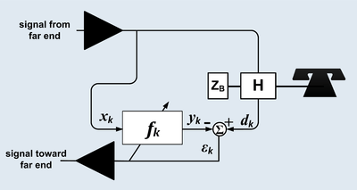 An adaptive echo canceler for a telephone circuit. The function of H, the hybrid transformer, is to route incoming speech from the far end xk to the local telephone and route speech from the telephone to the far end. However, the hybrid is never perfect, so its output dk contains both the desired speech from the local telephone plus filtered speech from the far end. The echo canceller is the adaptive filter fk, which attempts to minimize the error signal εk by filtering the incoming far end speech into a replica yk of the far end speech that leaks through the hybrid. Once the adaption is complete, the error signal consists mostly of speech from the local telephone.