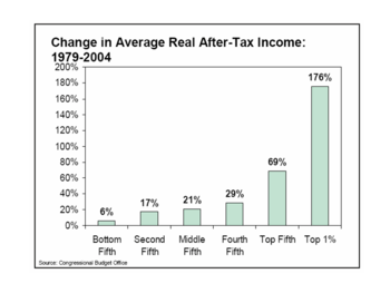 Many economists are critical of the Bush administration's policies and argue that the economy is only benefiting the wealthy, increasing inequality between the top 1% and the rest of society.[80] Economists Aviva Aron-Dine and Richard Sherman point to recent data from the Congressional Budget Office (CBO), showing that "the average after-tax income of the richest one percent of households rose from $722,000 in 2003 to $868,000 in 2004, after adjusting for inflation, a one-year increase of nearly $146,000, or 20 percent. This increase was the largest increase in 15 years, measured both in percentage terms and in real dollars."[20]