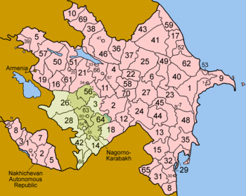 | 63 | Khojali District | Xocalı | Khojali | 940 | 26,500 | Yukhari-Karabakh | De facto in NKR |