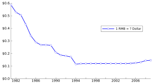 Just how long the trajectory could continue, however, remained unclear. According to the 11th five-year plan, China needed to sustain an annual growth rate of 8% for the foreseeable future. Only with such levels of growth, the leadership argued, could China continue to develop its industrial prowess, raise its citizen's standard of living, and redress the inequalities that were cropping up across the country. Yet no country had ever before maintained the kind of growth that China was predicting. Moreover, China had to some extent already undergone the easier parts of development. In the 1980s, it had transformed its vast and inefficient agricultural sector, freeing its peasants from the confines of central planning and winning them to the cause of reform. In the 1990s, it had likewise started to restructure its stagnant industrial sector, wooing foreign investors for the first time. These policies had catalysed the country's phenomenal growth. Instead, China had to take what many regarded as the final step toward the market, liberalizing the banking sector and launching the beginnings of a real capital market. According to an article in Journal of the Asia Pacific Economy authored by Mete Feridun of University of Greenwich Business School and his co-author Abdul Jalil from Wuhan University in China, financial development leads to a reduction in the income inequality in China.[53] This process, however, would not be easy. As of 2004, China's state-owned enterprises were still only partially reorganized, and its banks were dealing with the burden of over $205 billion (1.7 trillion RMB) in non-performing loans, monies that had little chance of ever being repaid. The country had a floating exchange rate, and strict controls on both the current and capital accounts.