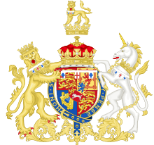 As a son of the sovereign, the Duke of Kent had use of the arms of the kingdom from 1801 to his death, differenced by a label argent of three points, the centre point bearing a cross gules, the outer points each bearing a fleur-de-lys azure.[18]