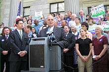 The first piece of legislation Rendell initiated was The Plan for a New Pennsylvania.[18] The Plan proposed using slot machine revenue to reduce taxes by $1.5 billion (an average 30% decrease for homeowners) and included $687 million in increased education funding. The plan was to be paid for with a proposed income tax increase from 2.80% to 3.75% plus increased taxes on utilities and beer. The governor's plan passed but with a smaller tax increase to only 3.07% and increased education funding of $450 million. The final budget deal included additional taxes on cigarettes and utilities.[19]