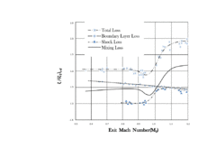 It is the evident that boundary layer profile loss dominates at subsonic exit mach numbers and the downstream wake mixing is about 30% of the total loss. But when the shock wave develops, the shock and the mixing losses dominates with nearly 100% increase in total losses at Mexit = 1.2. Part of mixing losses can be attributed to either the shock (which brings about sudden increase in the thickness of boundary layer) or the wake mixing losses. Wake width measured downstream increases rapidly with an increase in the mach number, while the wake width is nearly identical at the trailing edge.[9]