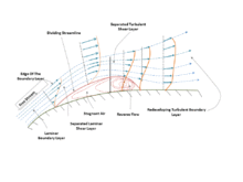 [3] The adverse pressure gradient which can be caused by the blade loading factor may result in the separation of the boundary layer. The layer may become separated at the trailing edge and re-attach depending on the flow separation, causing the formation of a separation bubble. The flow becomes fully turbulent after the reattachment and the boundary layer will separate near the trailing edge as the incident shocks strike the suction surface.